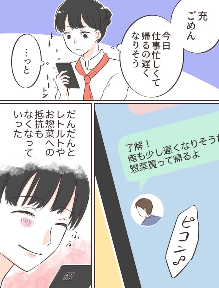 最近ではだんだんとレトルトやお惣菜への抵抗もなくなってきたようで、仕事で遅くなりそうな日に「充、ごめん。今日仕事忙しくて帰るの遅くなりそう」とメッセージを送ると「了解!俺も少し遅くなりそうだから惣菜買って帰るよ」と返信が来ました。自分で料理をするようになってから充は考え方も少しずつ変わって来て、私の負担にならないように気遣ってくれるようになって嬉しいです。