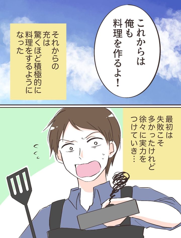 そして、「これからは俺も料理を作るよ!」と宣言した充。それからの充は驚くほど積極的に料理をするようになりました。最初は火加減がわからず焦がしてしまったりと失敗こそ多かったけれど、徐々に実力をつけていきました。