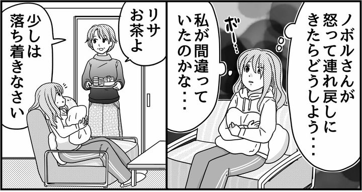 ノボルさん、また怒鳴り込んでくるんじゃないかな。激怒して連れ戻しに来たらどうしよう。やっぱり、私が間違っているのかも……そんな私の不安な気持ちを見透かしたように「大丈夫。ここは安全だから。何も心配いらないからね」と母が声をかけてくれます。