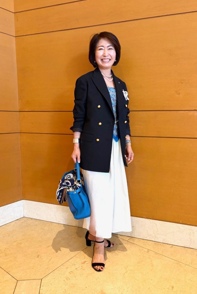 「紺ブレをメインにして、『エルメス』のスカーフをビスチェ風に巻き、パーティーの席にも合う華やかコーデにしました。普段からファッションが大好きで、昔のものといまのもの、そしてハイアンドローの組み合わせを楽しんでいます」