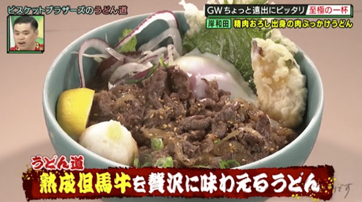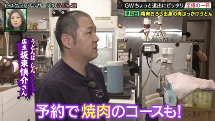 2軒目は、原田の地元でもある岸和田市のお店。うどん店といいながら、各テーブルの上に排煙ダクトがあり、どう見ても「焼肉屋さん」だがそれもそのはず。実はこちら、予約すれば焼肉も楽しめるちょっと珍しいうどん屋さんなのだ。店主がもともと精肉卸の仕事をしていたとあり、肉の目利きは折り紙付き。一頭買いした但馬牛とこだわりの麺で作る、超贅沢な看板うどんに、きんが「両方一流や。ヤバい!」と悶絶する!?