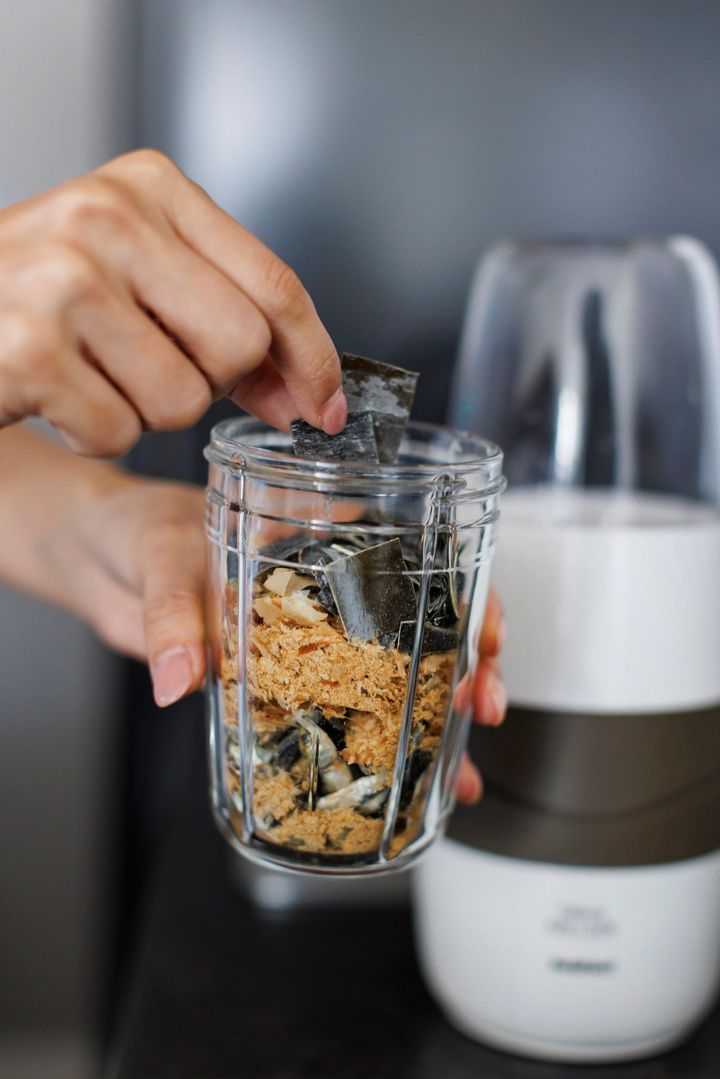 「仕事で帰りが遅くなった日はデパ地下のお惣菜に頼ることもありますが、そんな時でも手作り出汁でつくったお味噌汁は欠かさないようにしています。昆布といりこ、鰹節をミキサーにかけるだけで簡単。ふりかけとしてご飯にかけて食べても美味しいので、子どもたちも喜んで食べています」