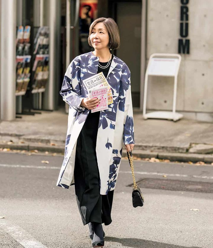 花柄コート¥97,900 黒ジャンプスーツ¥103,400(ともにAKIKO OGAWA/アキコ オガワ)ネックレス¥69,300イヤリング・右¥23,100左¥17,600(すべてENAK…/エナッ)バッグ、靴/スタイリスト私物