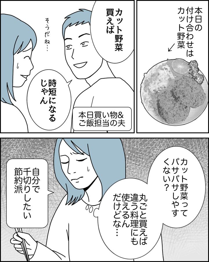 夫からのありがたーい提案。買い物からご飯作りまでやってくれるからこそ気づく、ありがたーいご意見。もちろん時短になることは、妻は十分わかっています。しかし、妻はどうしても購入したカット野菜特有のパサパサ感が苦手で……。カット野菜を氷水にさらせばフレッシュさはある程度戻りますが、それだと時短になりません。それに野菜を丸ごと買えば違う料理にも使えて「節約になる!」……といろいろ思っていても、家事に協力的な夫の気分を害したくないので今日も言い出せず……。ちょっとした価値観の違い、難しいですねえ。