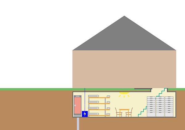 スイスには昔から地下室を持つ家が多く、国が補助を出して地下室をシェルターに改造するよう促し、家庭への設置を進めました。あわせて学校などに大きなシェルターをつくり、地下室がなかったり改造費用が出せなかったりする家の避難先としました。