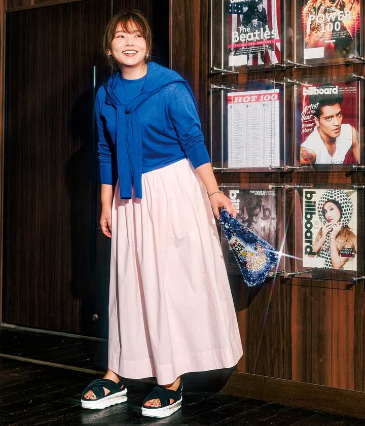 楽しみにしているライブでは好きという高揚感もオシャレもどちらも大切にしたいから配色が映えるブルーと揺れ感のあるピンクスカートでその時間を思いきり楽しみます。キャッチーなバッグと疲れないスポサンを相棒にして!