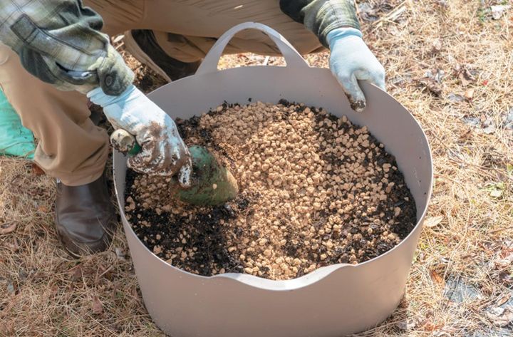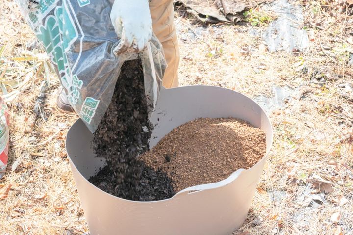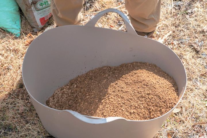 ②の小山のベースとなる土に、腐葉土と化成肥料を加えてよく混ぜ合わせる。肥料の目安は、盛り土1ℓに対して2g程度。