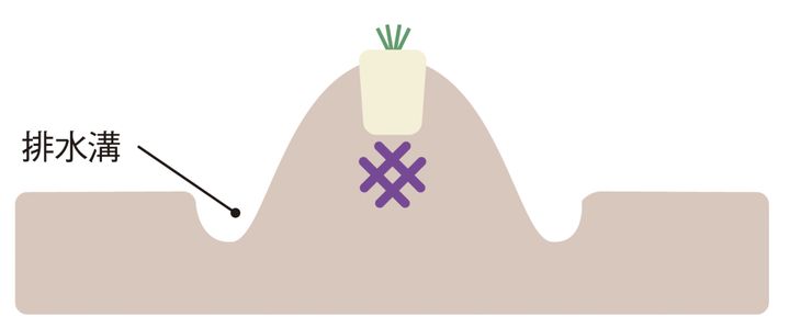 ①で作った小さな山のすぐ隣に沿うようにして、排水用の溝を掘る。高低差をつけることで、水はけのよい環境ができる。