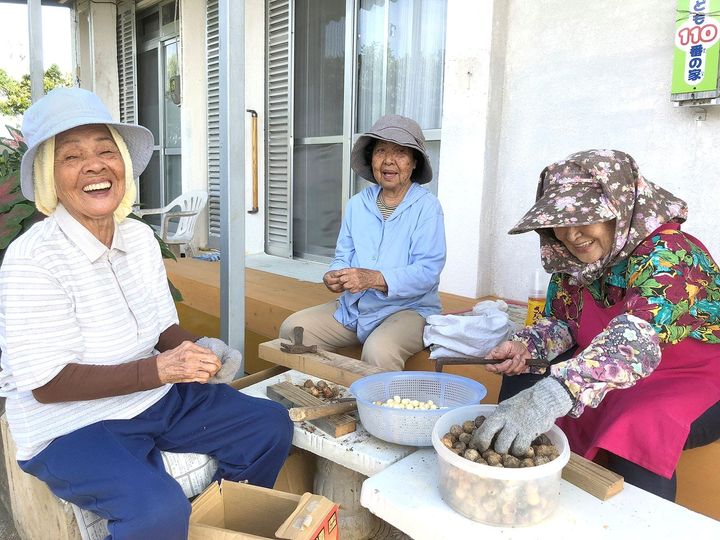 働き世代が島外へ流出し、過疎高齢化が進む地域に必要なのは、特産品をつくる大きな工場や数百人単位で訪れるマス・ツーリズムではなく、いつでもどこでも自分のペースでできるたくさんの「小さな仕事」だと考えた三輪さんたち。タマヌオイルのもととなるテリハボクの種の収穫や殻割りなどの仕事を、島の人々に依頼している。