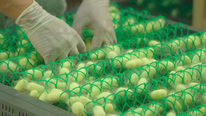 絹糸用に生産されるまゆとは異なり、みどりまゆは黄緑色 Hearst Owned