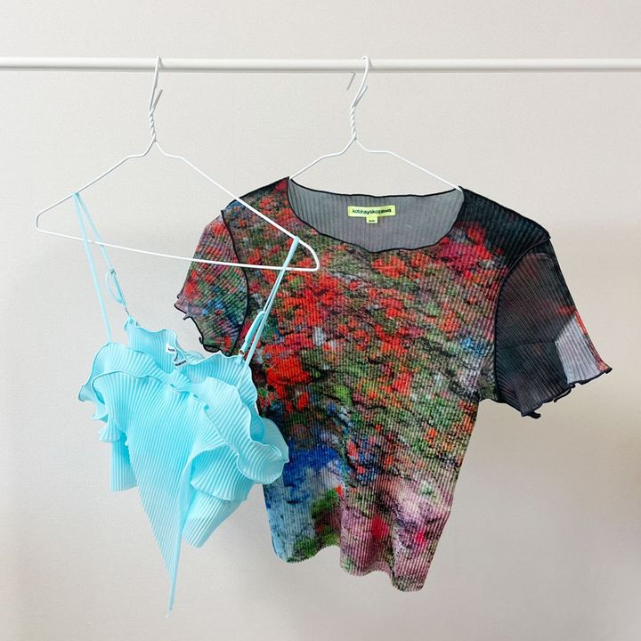 「『コトハヨコザワ』のトップスとビスチェは、鮮やかなカラーがワードローブを一気に盛り上げてくれます。トップスは1枚で着るだけでサマになる、グラフィックデザインがお気に入りです。フリルが可愛いビスチェは軽やかな心地なので、暑い夏でもレイヤードコーデが叶うのがポイント。別々に着るのはもちろん、両方合わせて着ても、めっちゃ可愛いです♡」(編アシ・T/5歳女の子のママ)