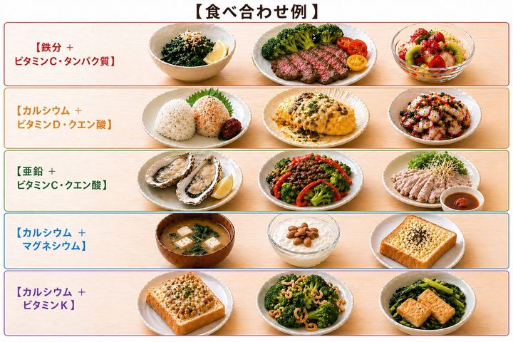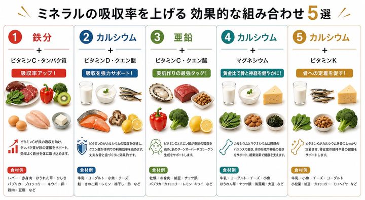 ミネラルは、ただ単体で摂るよりも、特定のビタミンや栄養素と組み合わせることで、体内への吸収率が劇的に上がったり、その働きがより活性化したりする。せっかく食べた栄養を無駄なくしっかり体に取り入れるために、今日から実践したい最強の「食べ合わせ」を5つ紹介しよう。