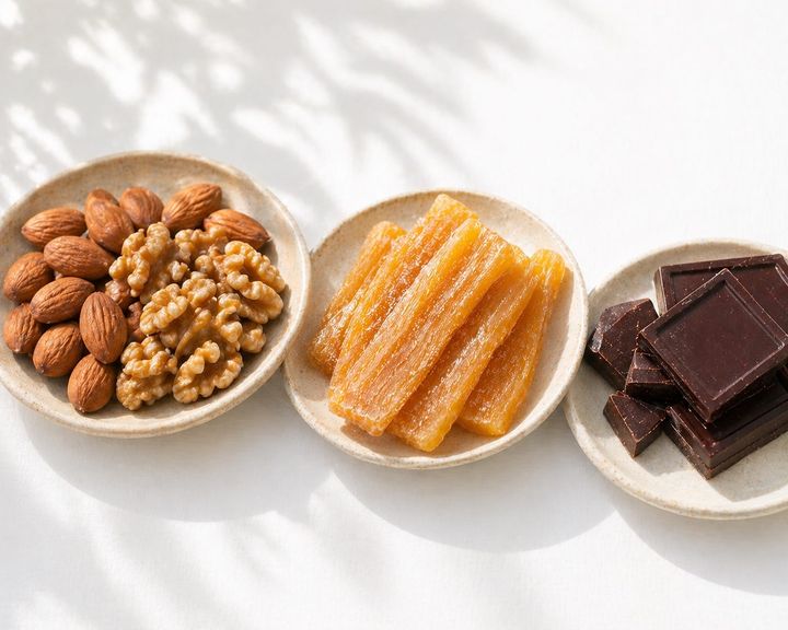 カカオ分が70%以上のダークチョコレートには、マグネシウムや鉄、亜鉛などのミネラルが含まれている。さらに、美容や健康のサポートとしてカカオポリフェノールも摂取できるため、仕事のリフレッシュやちょっと甘いものが欲しいときのレスキューおやつとして常備しておくと安心。(参考:農林水産省「食事バランスガイド」)