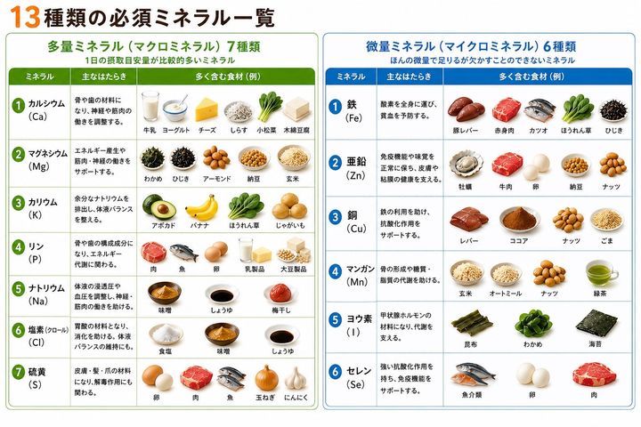 【種類別】ミネラルが豊富な食べ物一覧表(多量・微量)