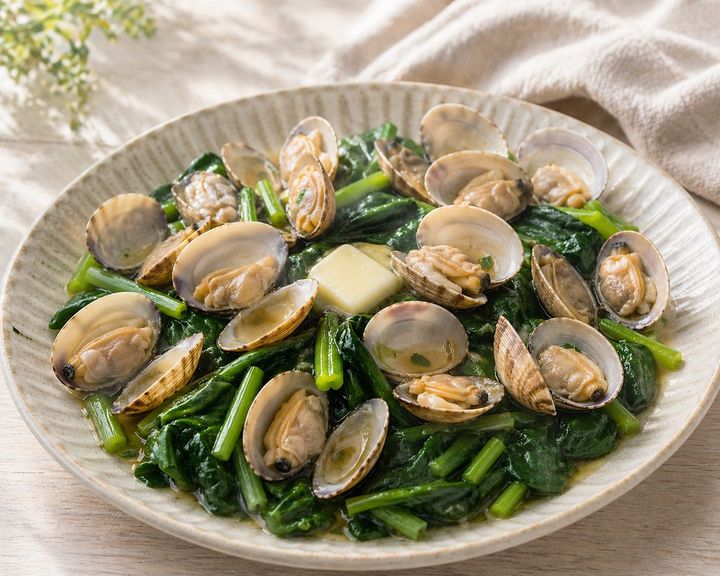 鉄分と亜鉛が豊富で旨味たっぷりのあさりと、非ヘム鉄とビタミンが詰まったほうれん草を組み合わせた一品。あさりの出汁がほうれん草に染み込み、ご飯のおかずはもちろん、晩酌のお供にもぴったり。
