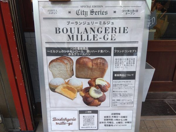 Boulangerie mille-ge(ブーランジュリー ミルジュ) 住所 : 兵庫県芦屋市松ノ内町1-20、アルパ芦屋2号棟104 (JR芦屋駅から徒歩3分) 電話番号:0797-62-6699 営業時間:10:00〜18:00 定休日:月・火・水曜 https://www.instagram.com/boulangerie_mille_ge/