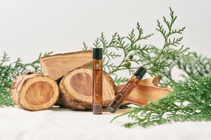 温浴サロンで使うヒノキパウダー以外に、オリジナルプロダクトブランドの「nifu」でも、吉野の林地残材を生かしたアイテムを展開。こちらのロールオン美容オイルには、保湿力の高いホホバ種子油に、高樹齢ヒノキの“節(Knot)”から抽出した希少な精油をブレンド。森の中にいるような癒しの香りで気分をリフレッシュできる。