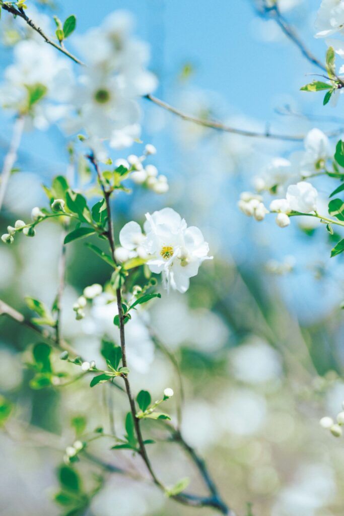 茶花としても知られる清楚な利休梅。足元の小さな野の花から青空に映えるウツギやコブシ、ボケまで、細川さんの庭にはさまざまな白い花が溢れている。