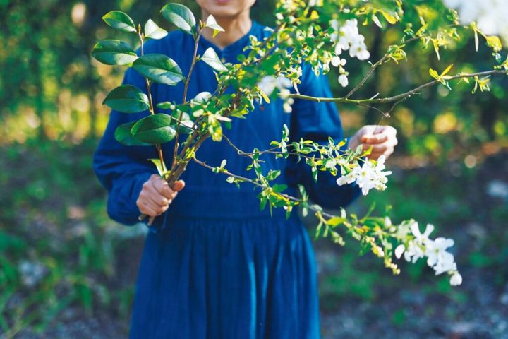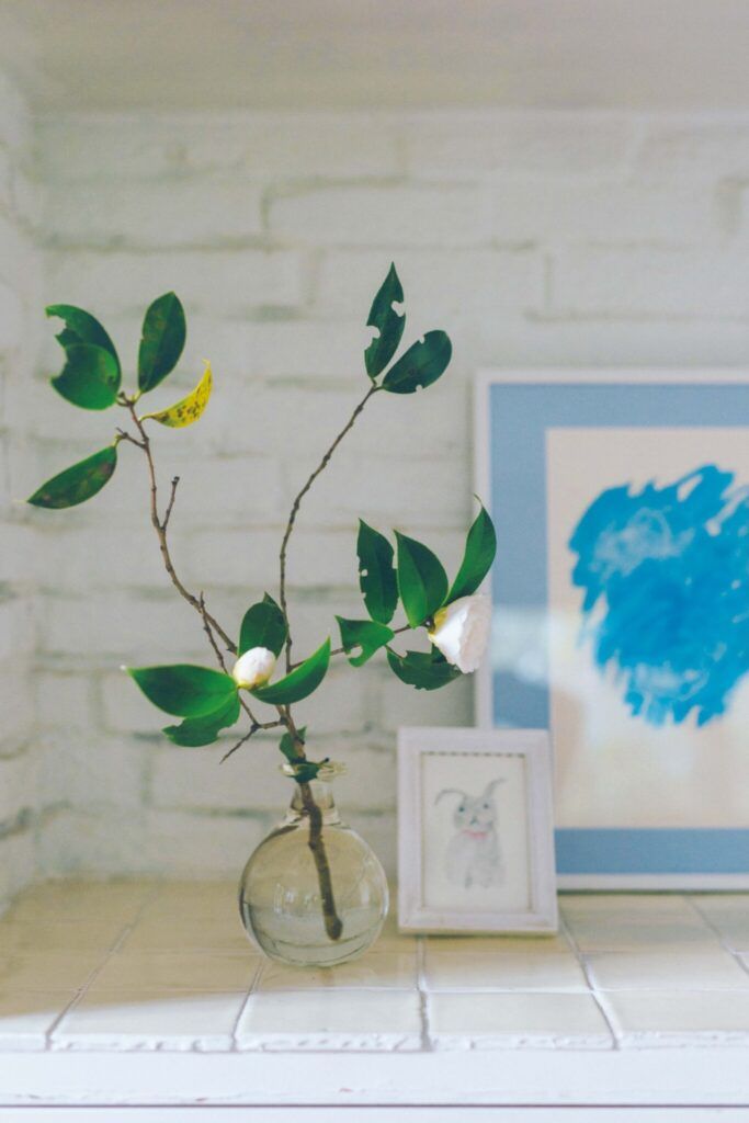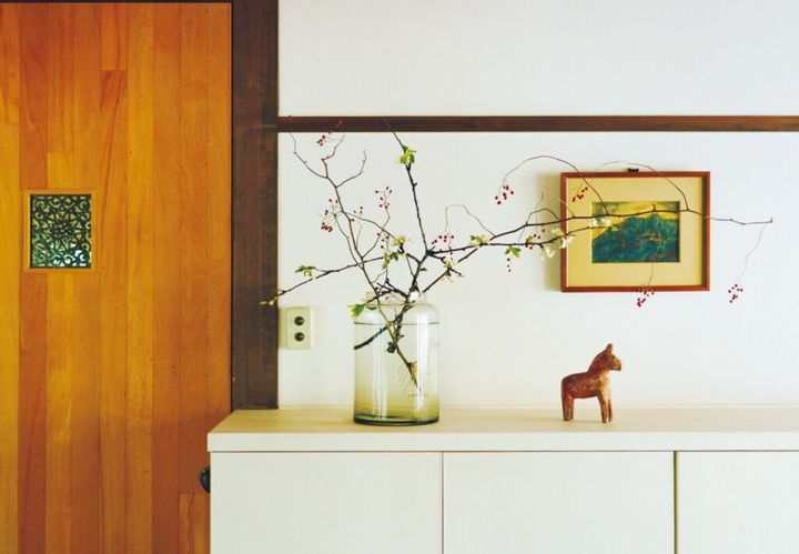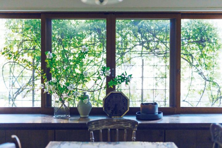 「部屋に花を生けるのは、庭木の剪定をしたときだけ。食堂の窓辺に挿したのは、屋根まで伸びた利久梅の枝を払ったものです。飾るというより、大きな花瓶に張った水を〝土〞に見立て、木立のように〝入れている〞感じ。枯れ葉も虫食いの葉も自然のまま、枝もなるべく触らないのがいい。庭からそのまま連れてきたさまが、いちばん美しいですから」