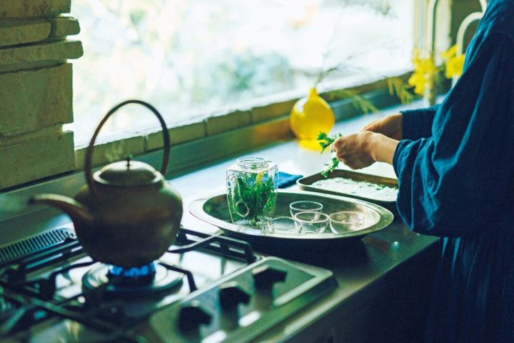 台所の勝手口そばの畑で摘んだフェンネル、マジョラム、ローリエに熱湯を注いだハーブティーは爽やかで濃厚。「庭は第二の食卓のような存在」