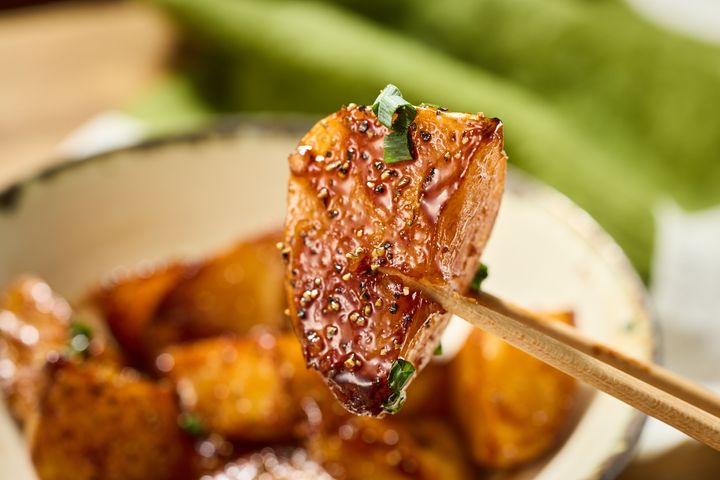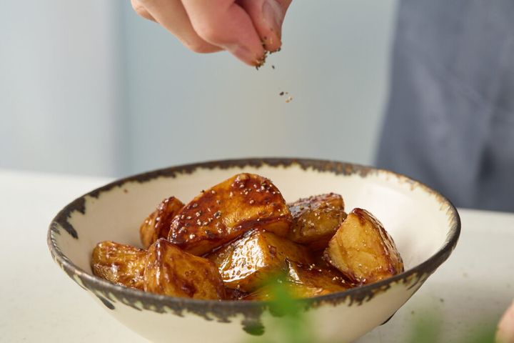焦げつきやすいので、目を離さず水分がとぶまでしっかり煮からめましょう。水分がとんでたれがとろっとしてきたら、じゃがいもがツヤツヤに輝きだします。