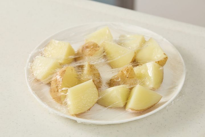 新じゃがはよく洗い、大きいものは3〜4cmに切る。水けを残したまま耐熱皿に並べてふんわりラップし、600Wのレンジで4分加熱する。