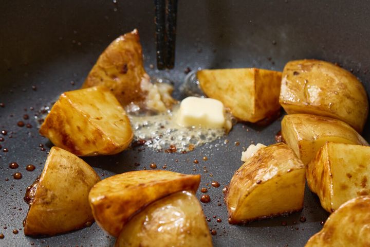 2段階のバター使いがキモ。バターは加熱で風味がとびやすいので、加熱しながらじっくりしみ込ませる用と、仕上げに香りを引き出す用で半分ずつ使うのがおすすめです。
