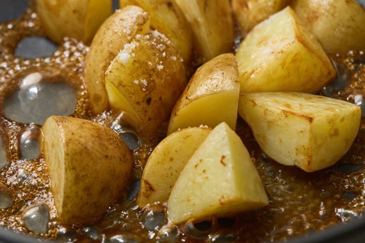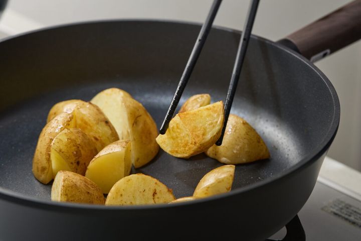 2.フライパンにバターの1/2量(5g)を中火で熱し、1のじゃがいもを入れ、皮に焼き色がつくまで、ときどきひっくり返しながら焼く。