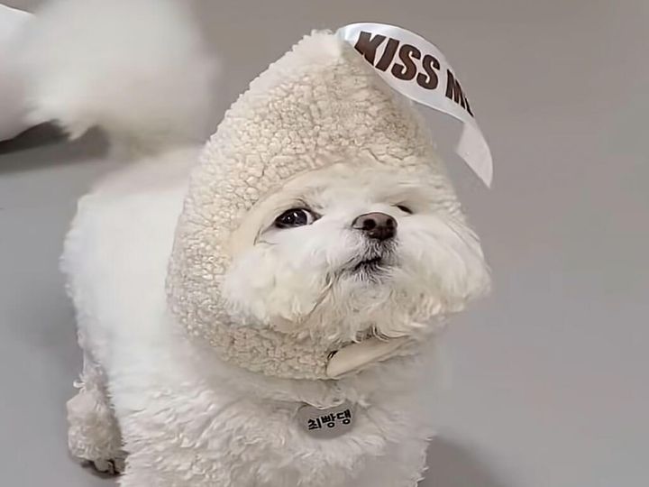 ふわふわの毛色と被り物の色が