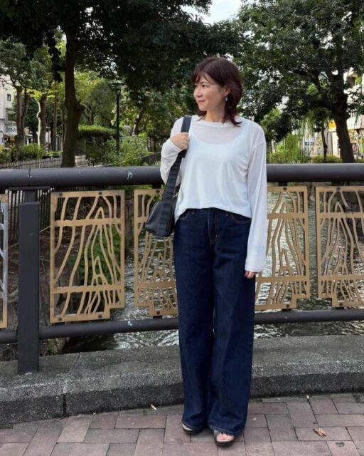 この春おすすめのトップスは「長袖のシアーTシャツ」。ほんのり透け感のある生地はシーズンムードたっぷり。しかもTシャツでありながら薄手のニットのように見えるため、40代50代のお出かけコーデにうってつけです。着心地がよく、イージーケアでOKなので気軽に使えますよ。