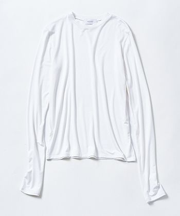 白ロングスリーブトップス/emmi(エミ ニュウマン新宿店) 竹繊維を配合した至極のやわらかさで、ストレッチの効いた高い密着感ながら窮屈さはなし。そでも長め。