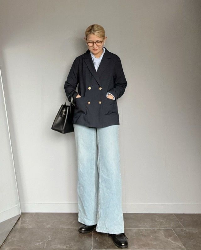 ボウタイブラウス×デニムパンツ×テーラードジャケットのコーデ