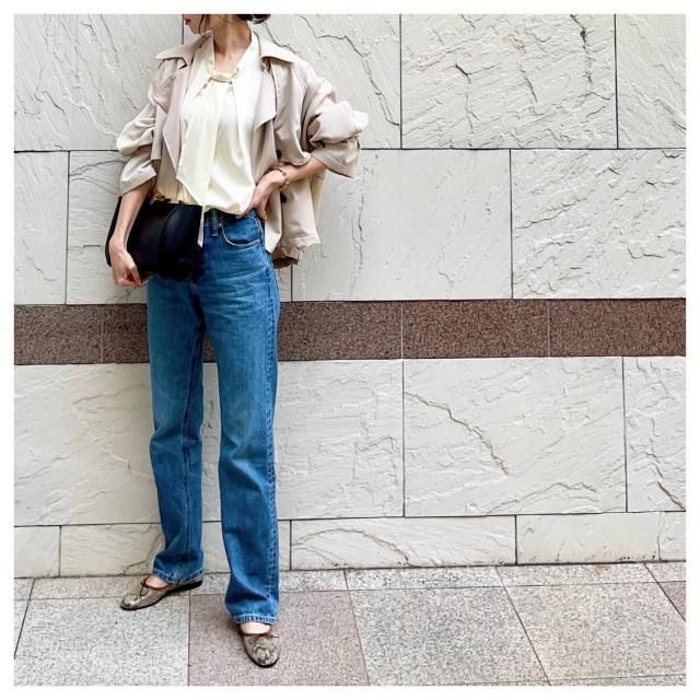 ベージュボウタイブラウス×デニムパンツのコーデ