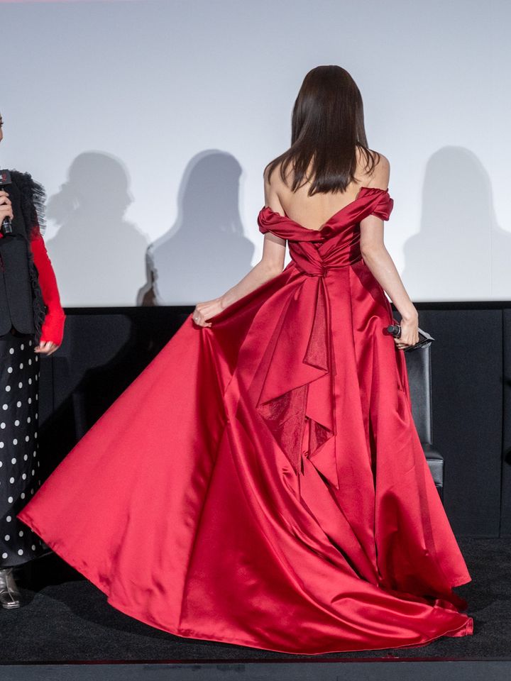 美しい赤いドレスで登壇。
