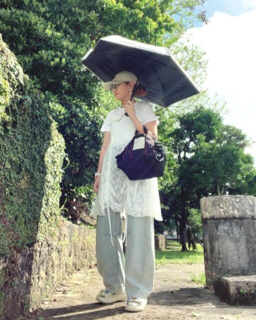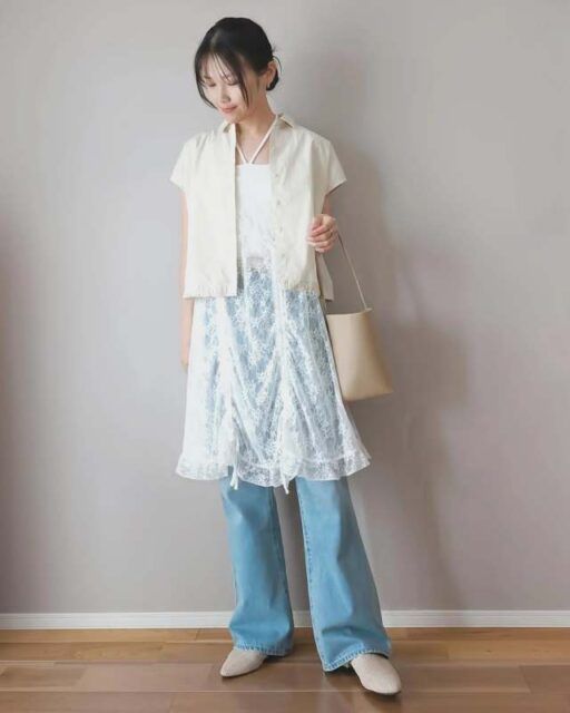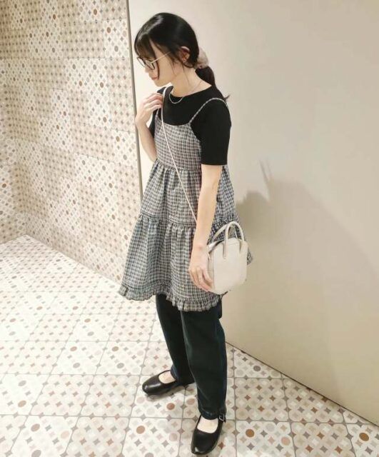 カジュアル派さんにおすすめなのが「ダボッとしたデニムパンツ・スウェットパンツ」との重ね着。ミニ丈キャミワンピースのおかげで、ゆるっとしたパンツの部屋着感が解消されてスタイリングがおしゃれ見え。今どきのテイストMIXコーデが即完成します。