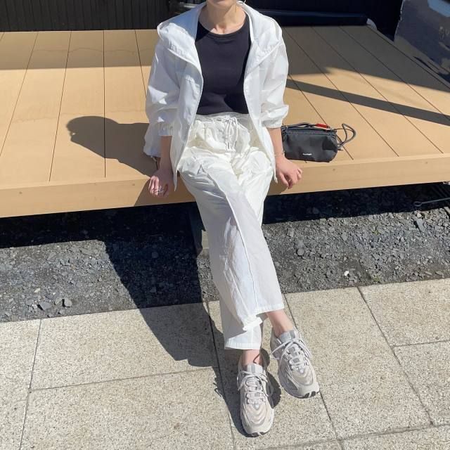 白マウンテンパーカー×スウェットパンツ・ジョガーパンツのコーデ