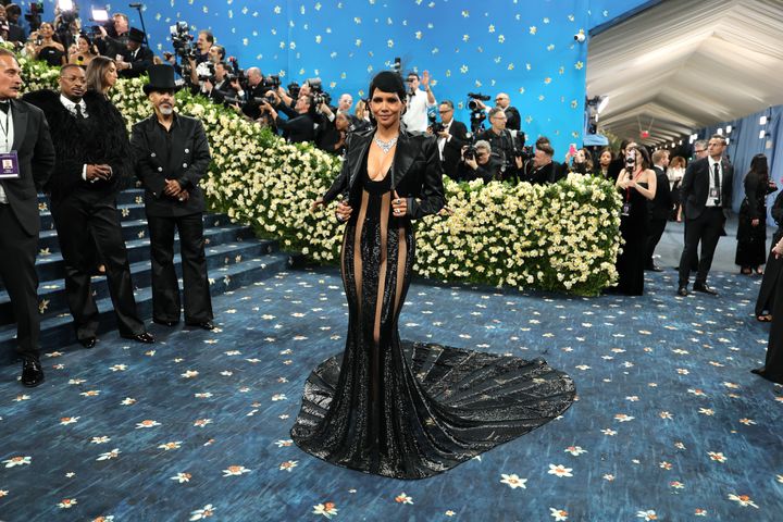 ハル・ベリーは、ブラックスパンコールのシアードレスに、タキシードジャケットを重ねたカスタムの「ラカン・スミス」で登場。大胆な透け感を持ちながらも、シャープなテーラリングが全体を引き締め、テーマにふさわしい“仕立て”の強さを宿したネイキッドドレスに。「カルティエ」のジュエリーできらめきも添えることで、センシュアルでありながら、媚びないパワフルなムードが際立つルックに。