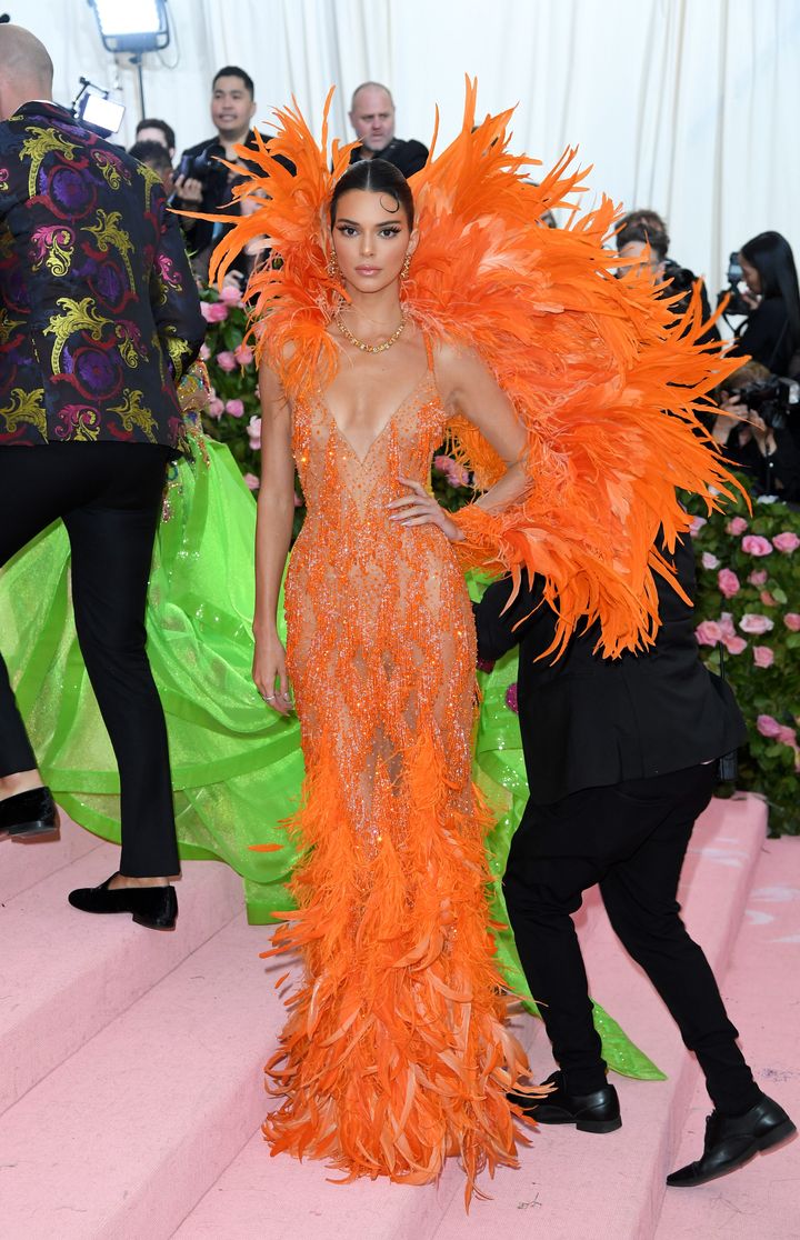 ケンダル・ジェンナーは、「ヴェルサーチェ」のオレンジのフェザーガウンで登場。鮮烈な色、きらめくボディ、そして大量の羽根という要素が、キャンプの“やりすぎ”をまっすぐ表現。ショーガール的な派手さを恐れず押し切った、2019年らしいネイキッドドレスだ。