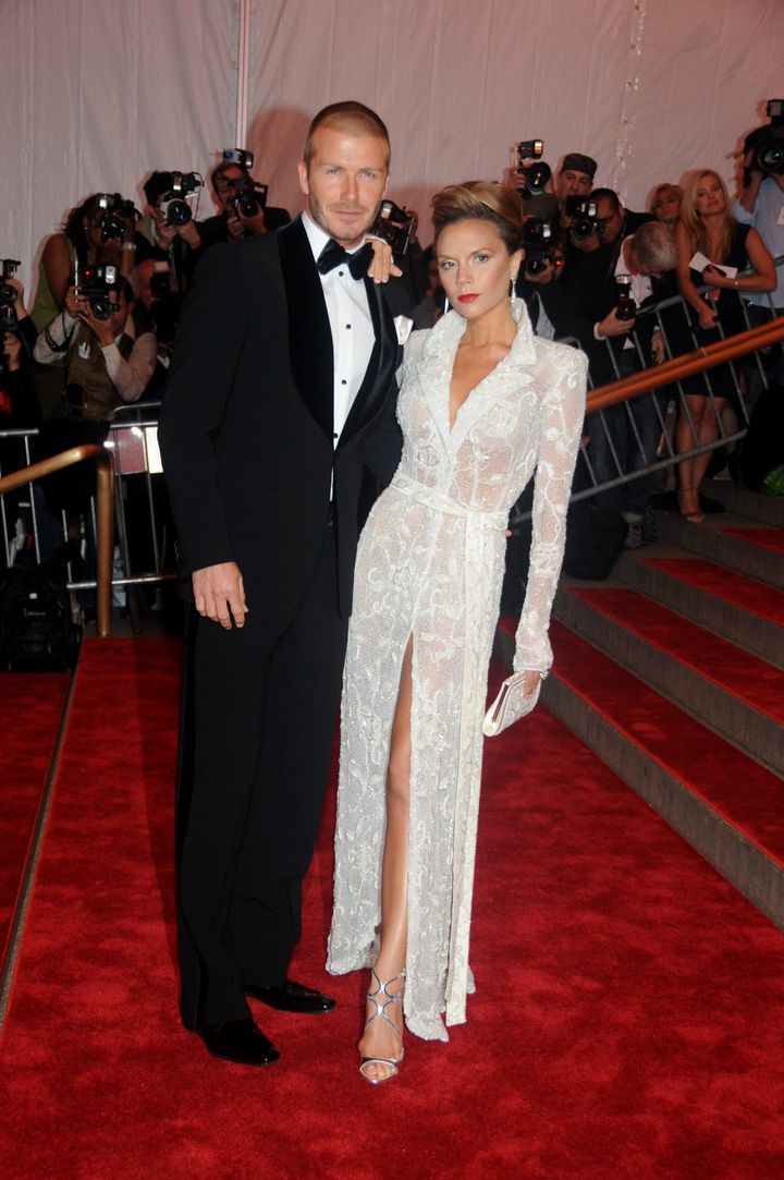 ヴィクトリア・ベッカムは、「アルマーニ」の白いシアーガウンを着用。繊細な刺しゅうと深いスリット、シャープなショルダーラインが、エレガントでありながら研ぎ澄まされた強さを感じさせる。コミック的な派手さではなく、身体のラインそのものを武器にするようなヒロイン像で、テーマを洗練された方向へと解釈した。