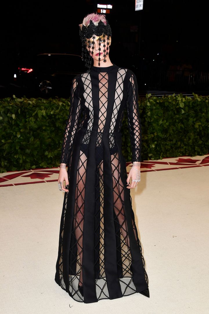 マリア・グラツィア・キウリによる「ディオール」のオートクチュールドレスを選択。格子状のパネルの間から肌をのぞかせるデザインは、どこか教会の装飾や懺悔室を想起させる。顔を覆うビーズのベールとピンクの ヘアカラーが、伝統的なテーマにカーラらしいパンクな精神を添える。