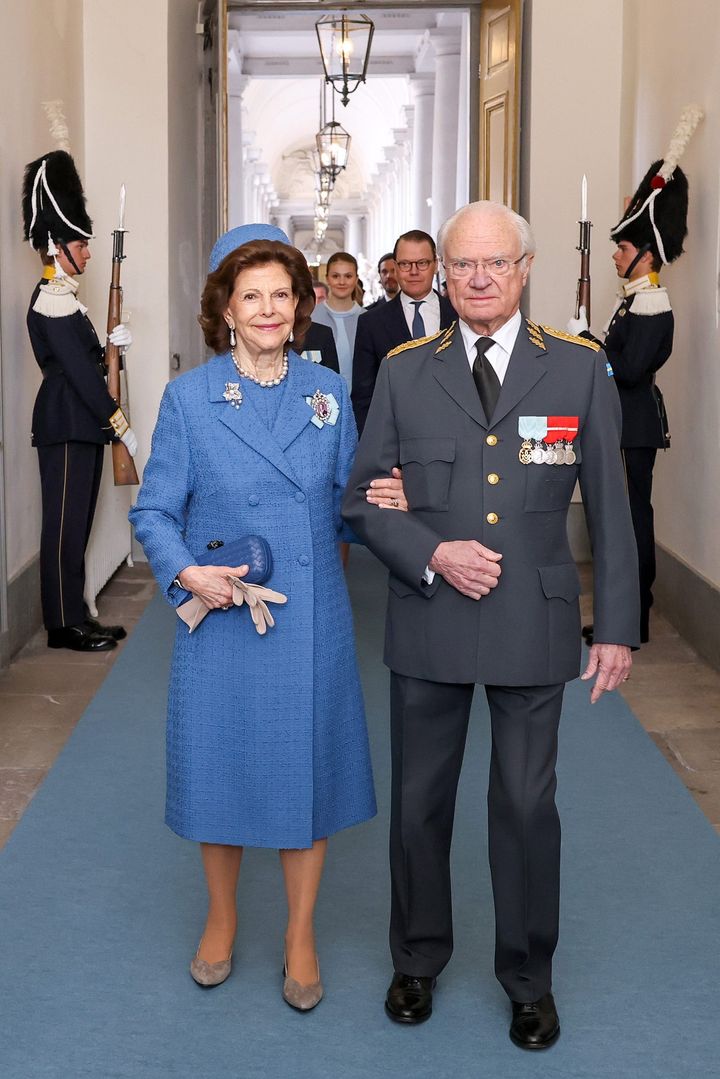 国王は軍服で登場。シルヴィア王妃と腕を組んで入場した。王位継承順位1位で相続人のヴィクトリア王太子も同じく軍服姿で夫のダニエル王子と現れた。第1子のエステル王女、その弟のオスカル王子ももちろん出席。